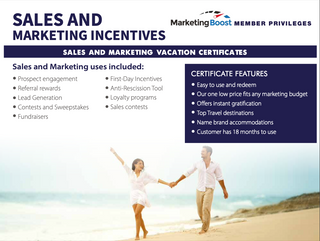 These incentives are meant to be used to generate NEW business or NEW prospects, not for your personal use as a MarketingBoost member for each new destination or to simply be giving vacations to the same people or friends and family or staff, etc. This is meant to be a tool to generate new Prospects or Customers for each of you. Not for personal use to each destination. We encourage all members to try us out and use one of the vacation incentives to see how the program works.