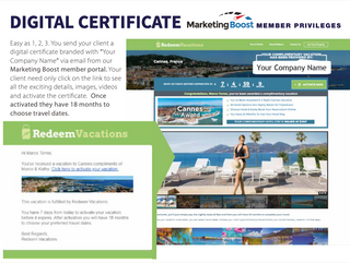 Your customer may activate an incentive online by paying the resort taxes and fees per night. Once they activate within 7 days of receiving the digital incentive your customer will have 18 months to travel. The end-user will get email receipt and links to redeemvacations.com to search for dates and be able to choose from participating hotels for desired dates based on availability. The process is all online. To date, we have redeemed tens of thousands of digital incentives and have a fantastic reputation that we are proud of!